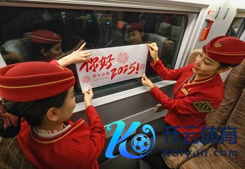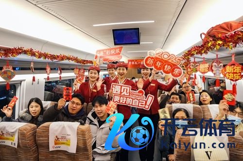 乘务东说念主员与游客在车厢内互动合影眷恋理财2025年的到来。(影相:杨宝森)
