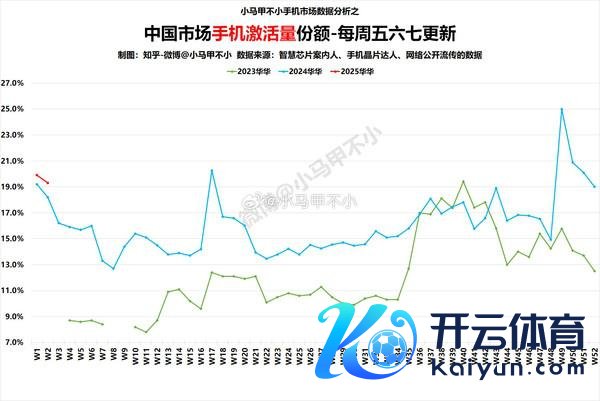从图片上看,在 2024 年年末,华为手机激活量份额达到了顶峰的 25%,随后几周虽有所下滑,但王人在 19% 以上,2025 年前两周的份额均接近 20%。