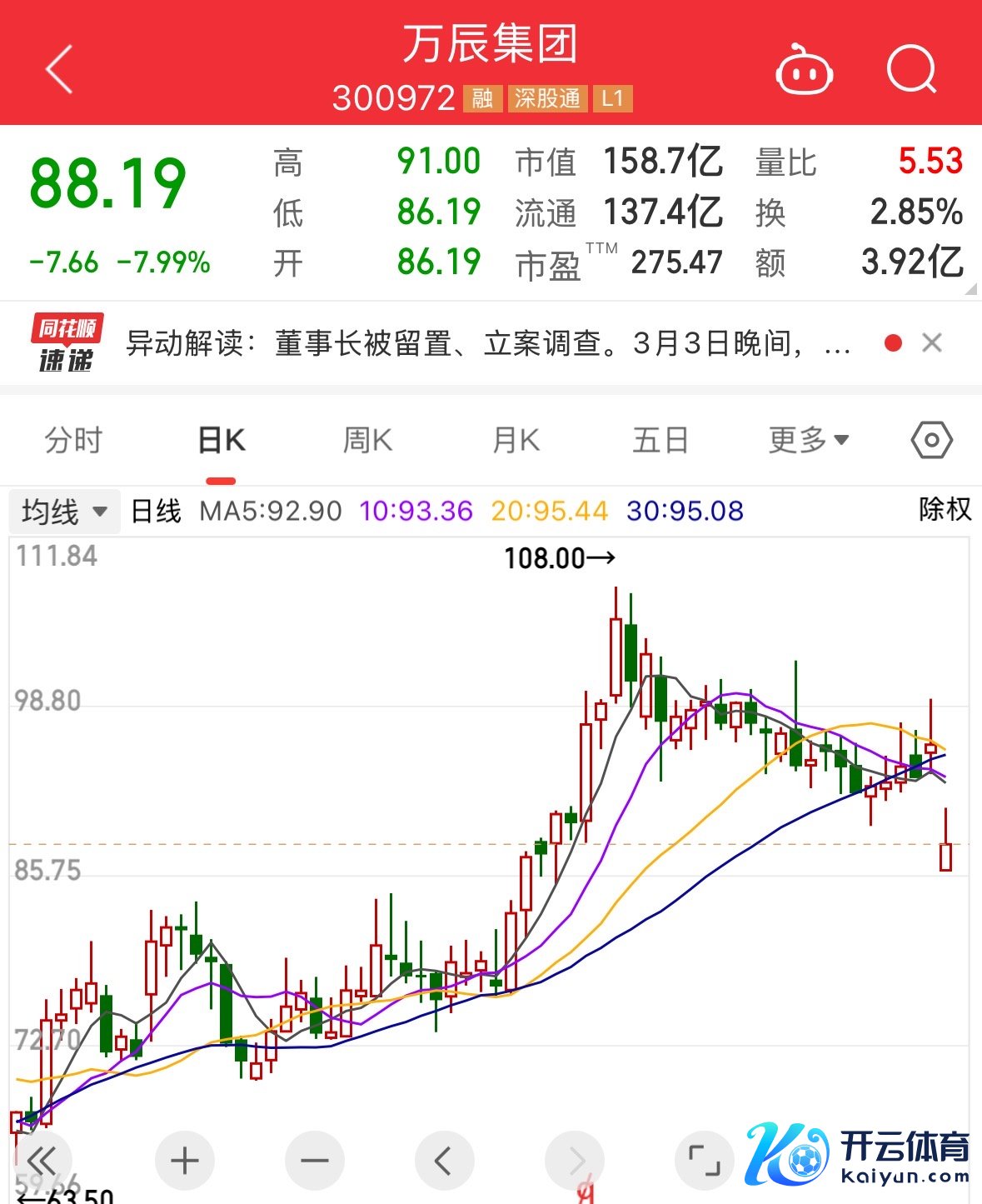 3月4日,万辰集团开盘后股价下降,解懒散稿,跌8%。